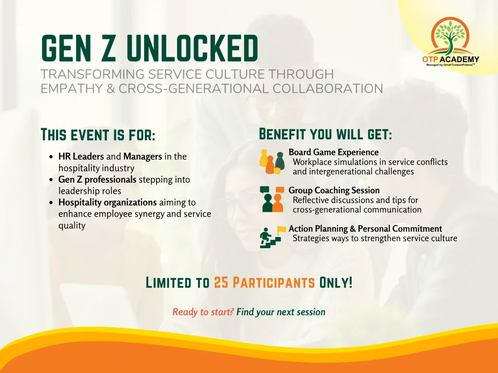 Program “Gen Z Unlocked” bertujuan untuk mentransformasi budaya layanan melalui empati dan kolaborasi lintas generasi, khususnya bagi para pemimpin HR dan profesional muda di industri hospitality. Dengan menggunakan metode interaktif seperti simulasi board game, sesi group coaching, dan penyusunan rencana aksi nyata, pelatihan ini dirancang untuk memperkuat sinergi tim serta mengatasi tantangan komunikasi antar generasi di lingkungan kerja.