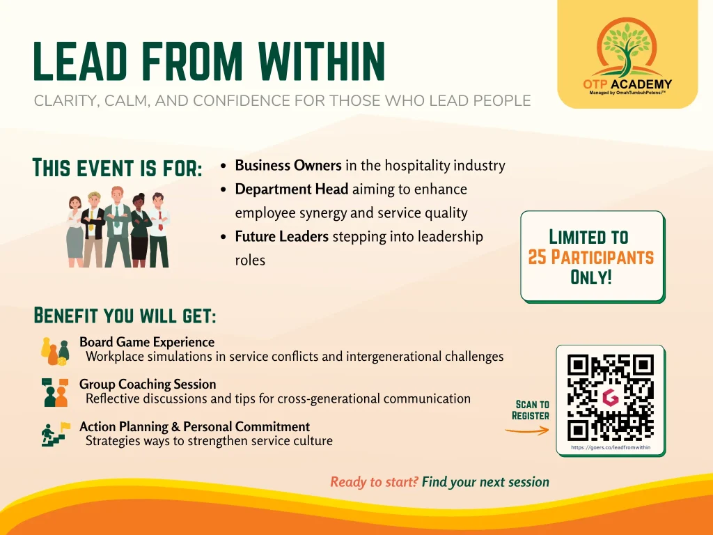 Program “Lead from Within” dirancang untuk para pemilik bisnis, kepala departemen, dan calon pemimpin di industri hospitality guna membangun kejernihan, ketenangan, serta kepercayaan diri dalam memimpin tim. Pelatihan ini menggunakan pendekatan praktis melalui simulasi board game untuk menangani konflik layanan, sesi group coaching untuk komunikasi lintas generasi, dan penyusunan komitmen pribadi guna memperkuat budaya pelayanan yang berkualitas.